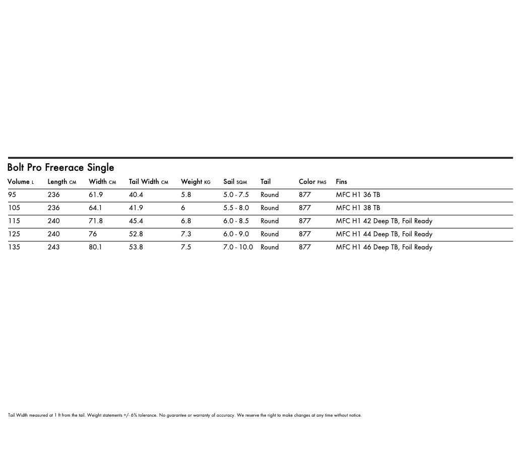The 115, 125 and 135 now come as Foil Ready constructions allowing the use of a hyrdofoil. The Bolt line focusses on increased widths that will primarily add to your average speed around the course while still focusing on top end performance with tail cut-outs and the infinite tail rocker acceleration our Bolts are known and praised for.