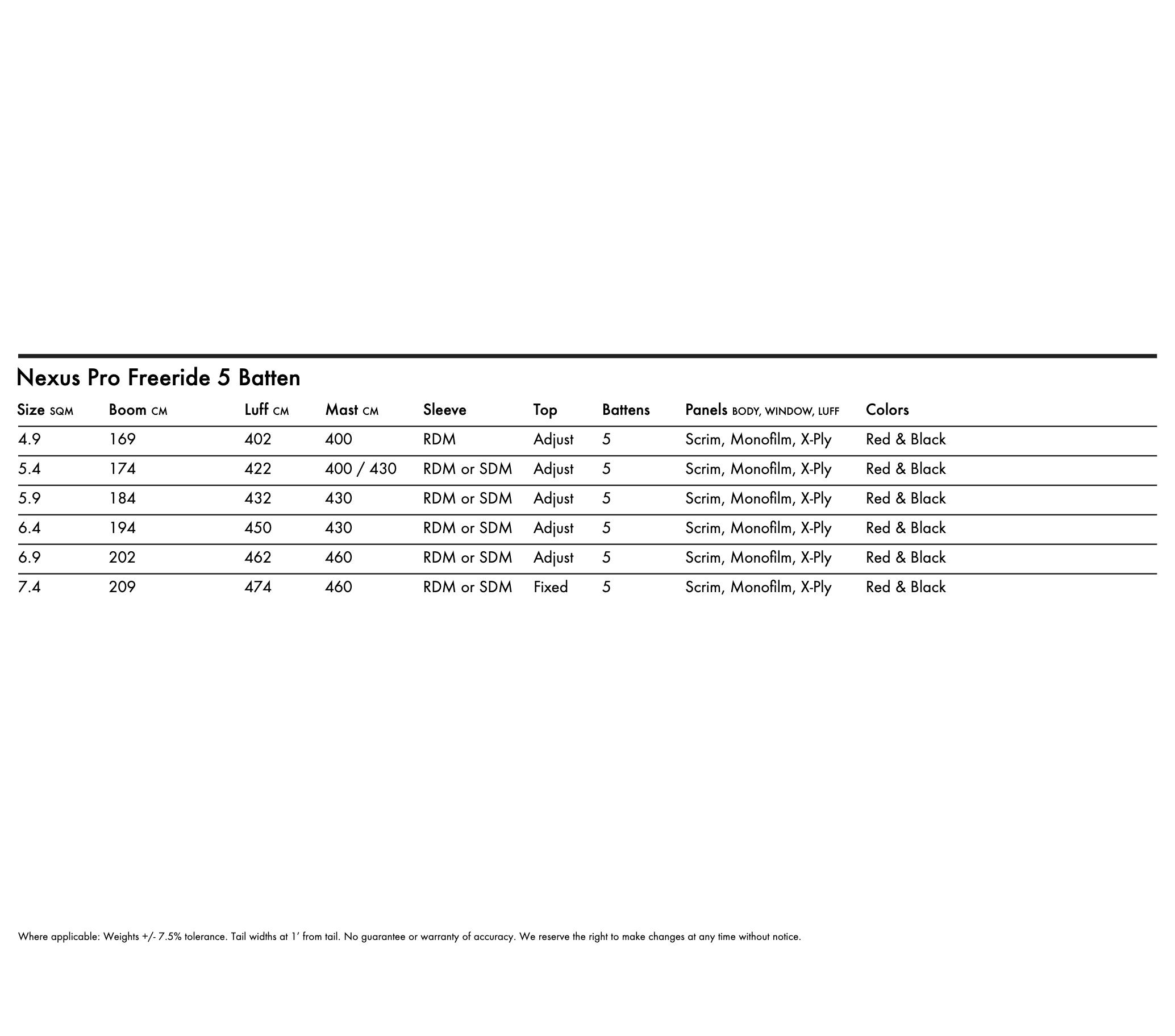 The light, easy handling of the Nexus Pro makes light wind sailing more fun, and powered up sailing more comfortable. Smaller sizes are cut with higher foots for tight maneuvering, and larger sizes are cut more for low-end power and speed. The Nexus Pro transforms to suit the conditions.